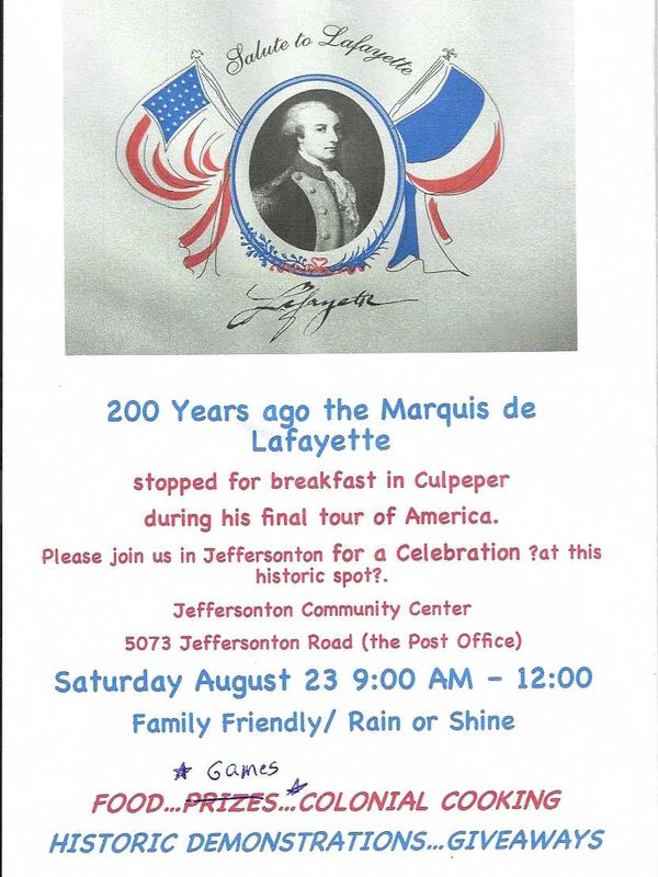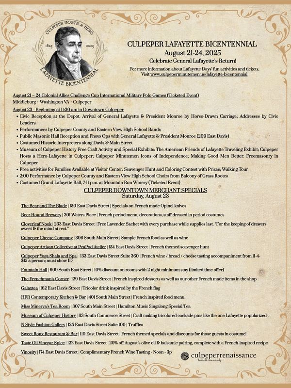 Celebrate the spirit of Lafayette’s Grand Ball hosted in Culpeper 200 years ago! An evening of elegance and merriment held in honor of the Marquis de Lafayette’s historic return to Culpeper. English Country Dance called by Mr. Charles Steplively and Elaine Sturgeon to a historical live quartet, light supper and hosted bar.